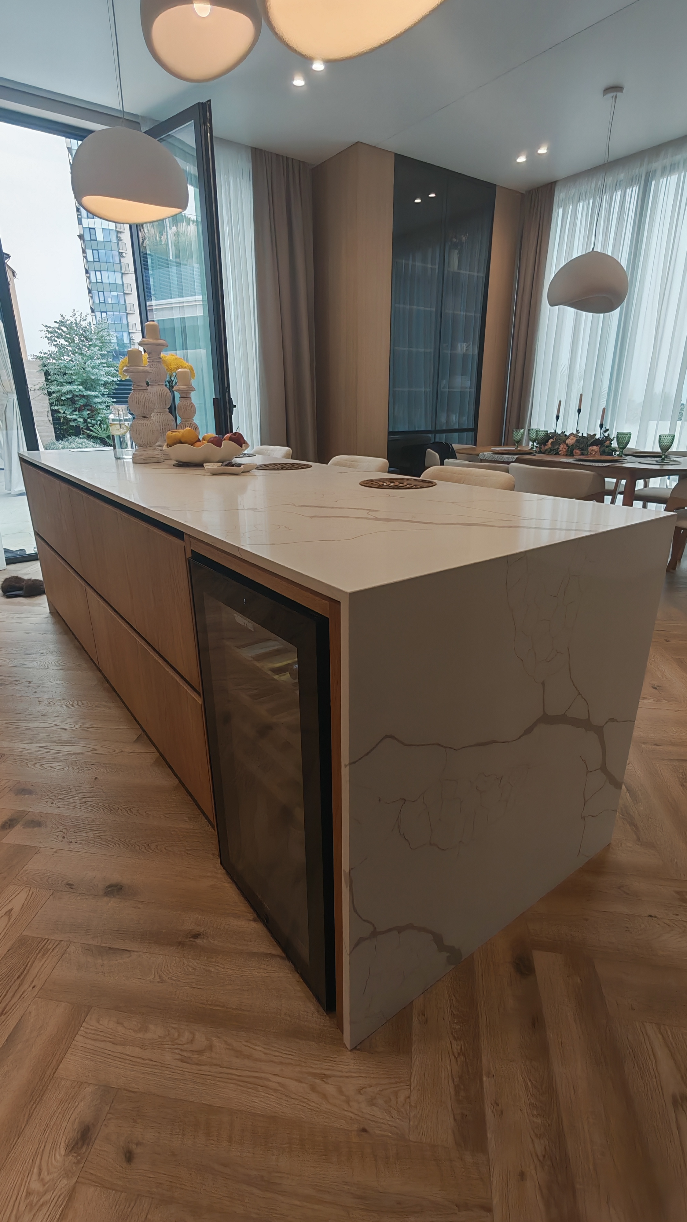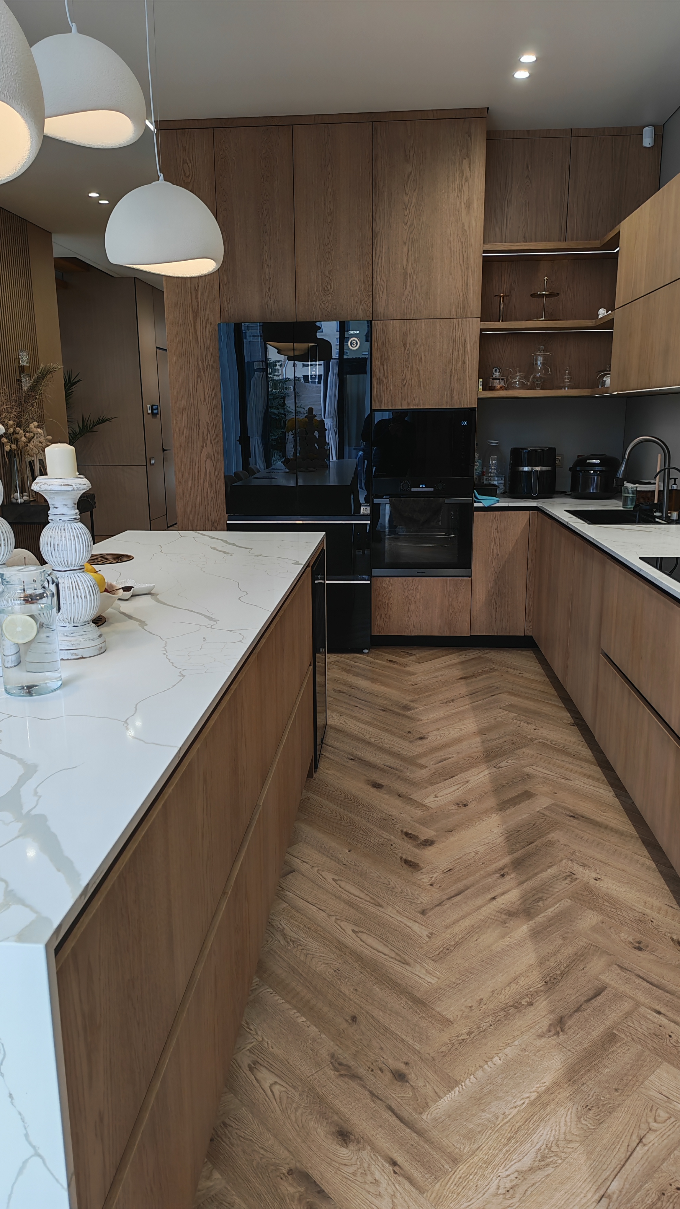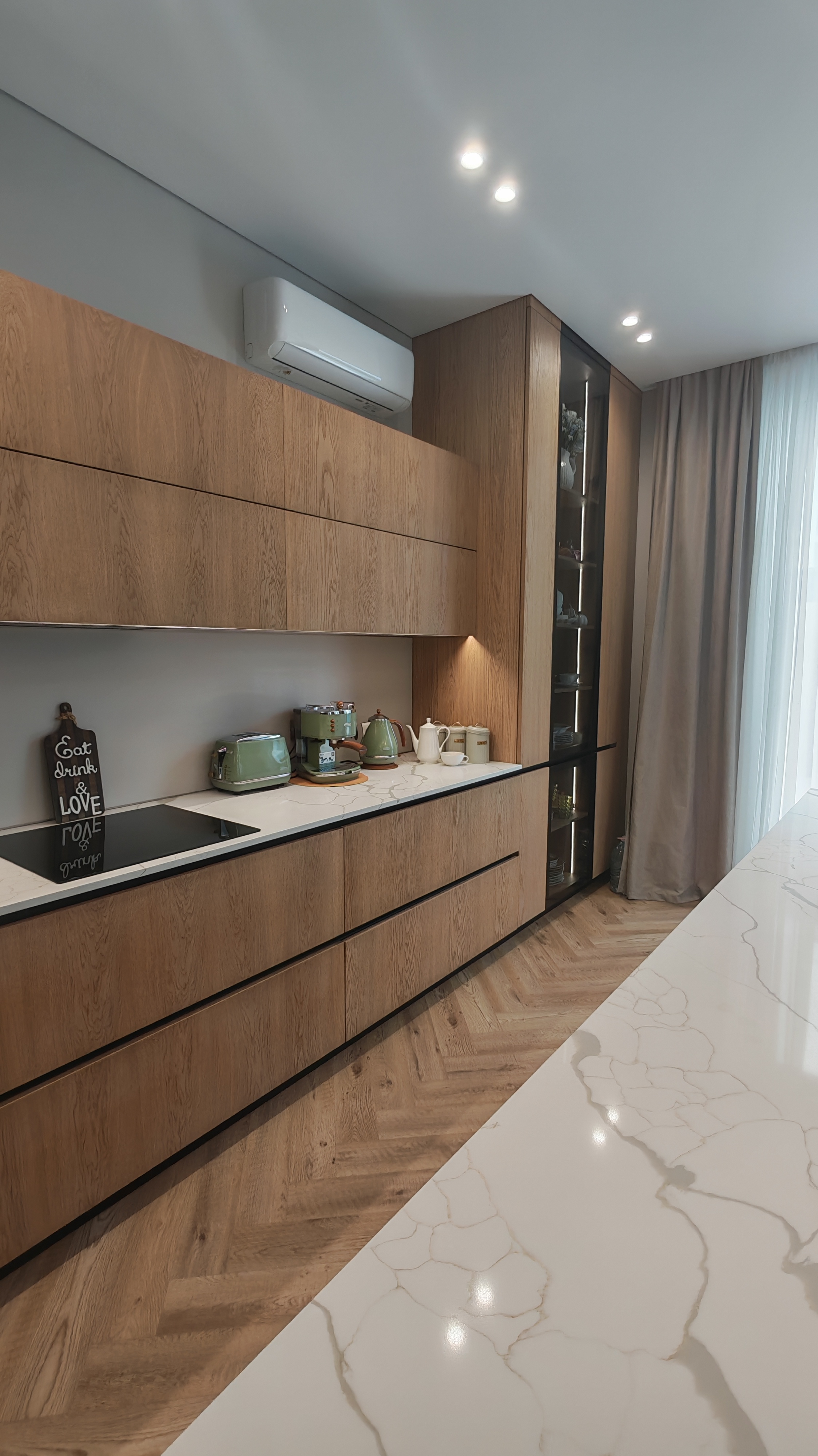 Фасады с выраженной древесной текстурой сочетаются с каменными столешницами и лаконичной геометрией.