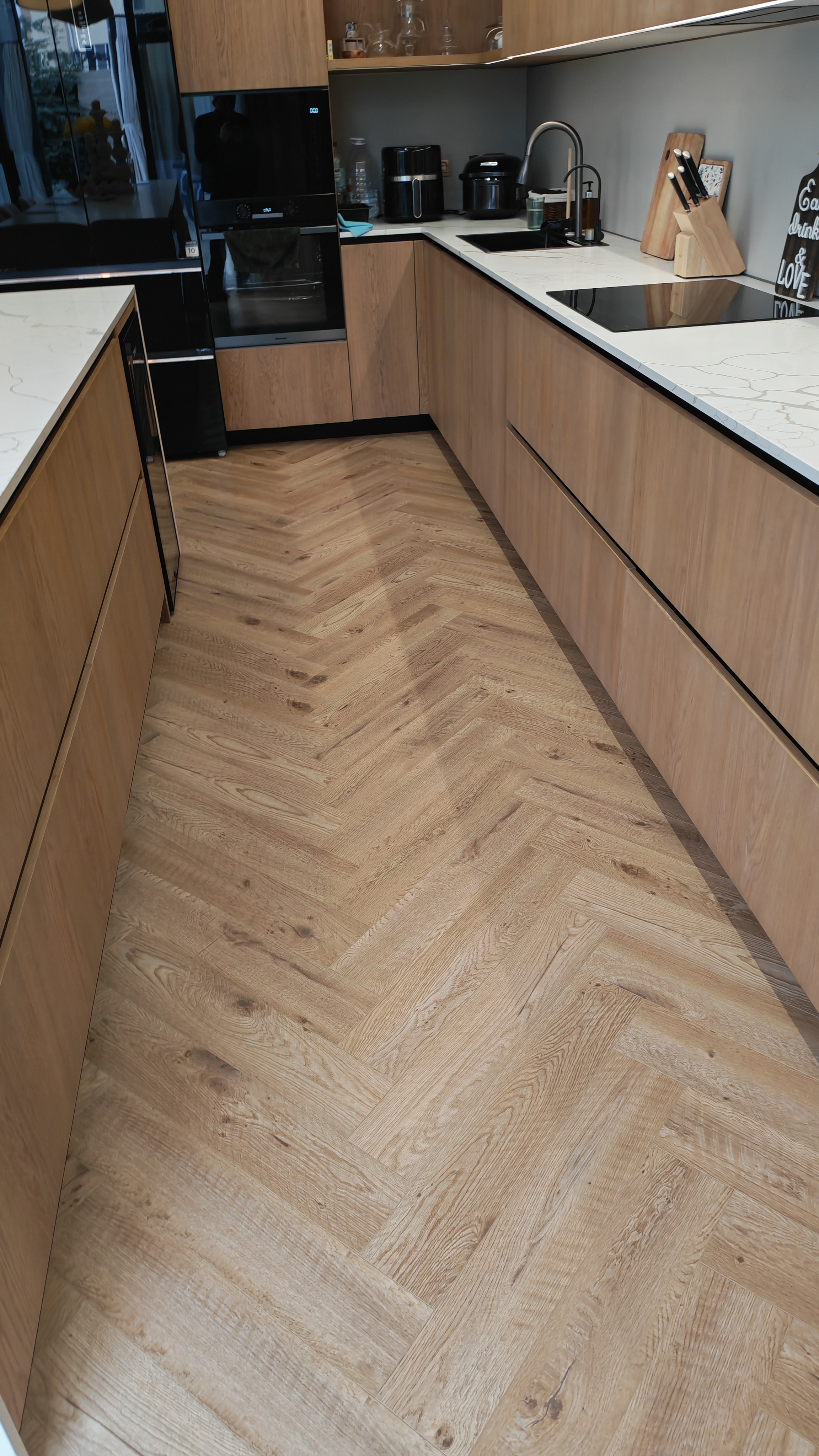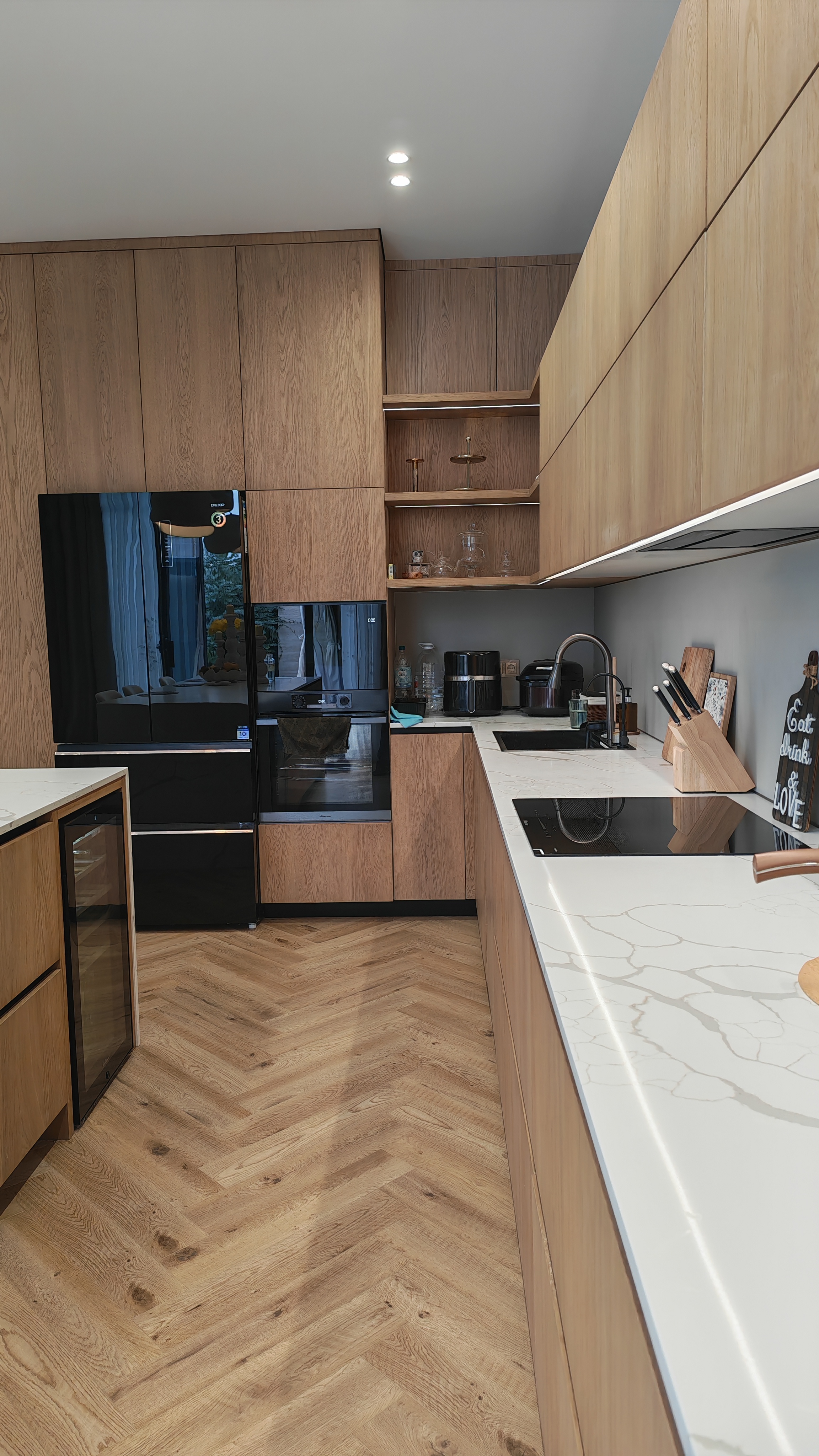 Кухня выполнена из натурального шпона, что придаёт интерьеру тёплый, живой характер.