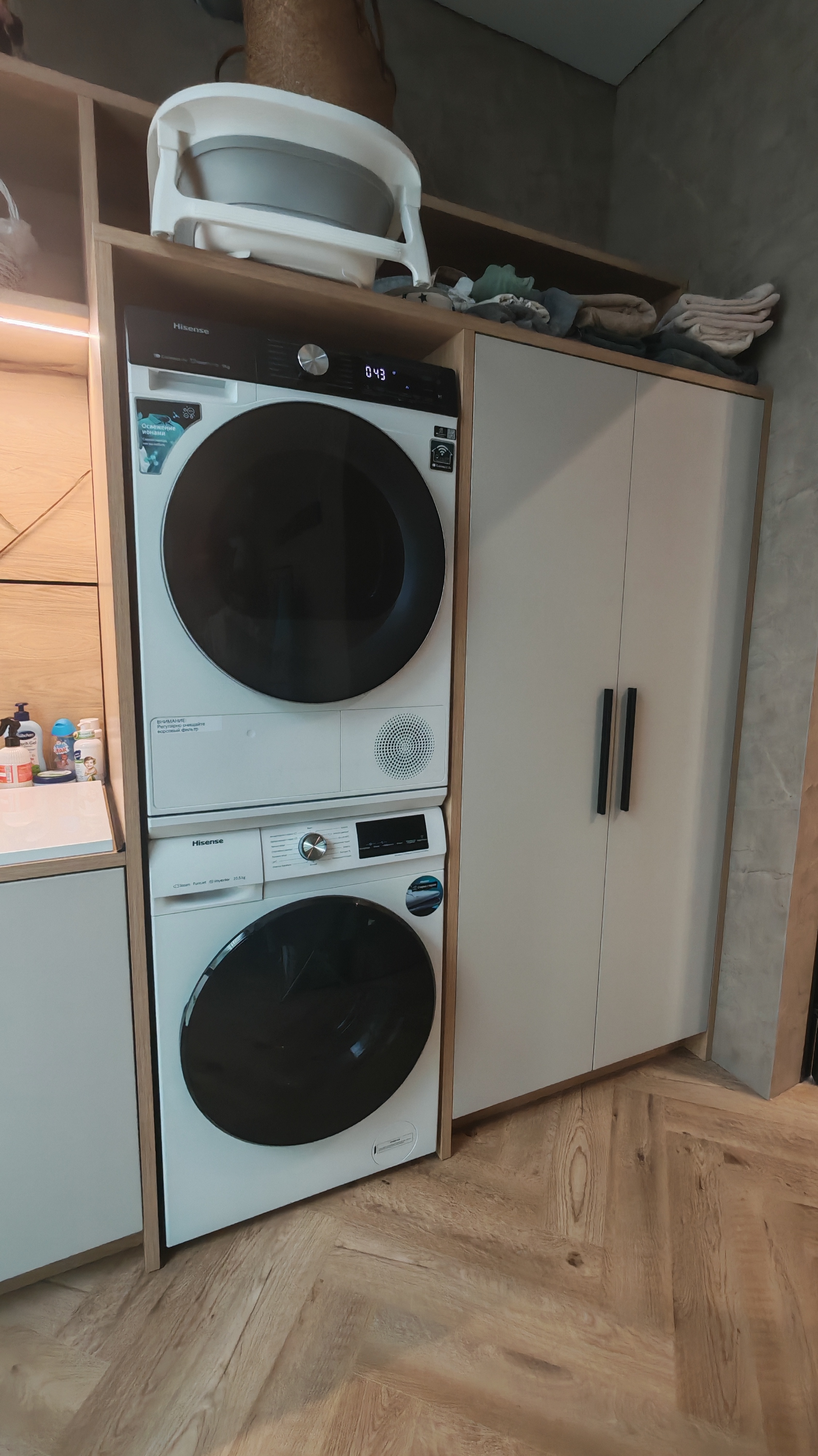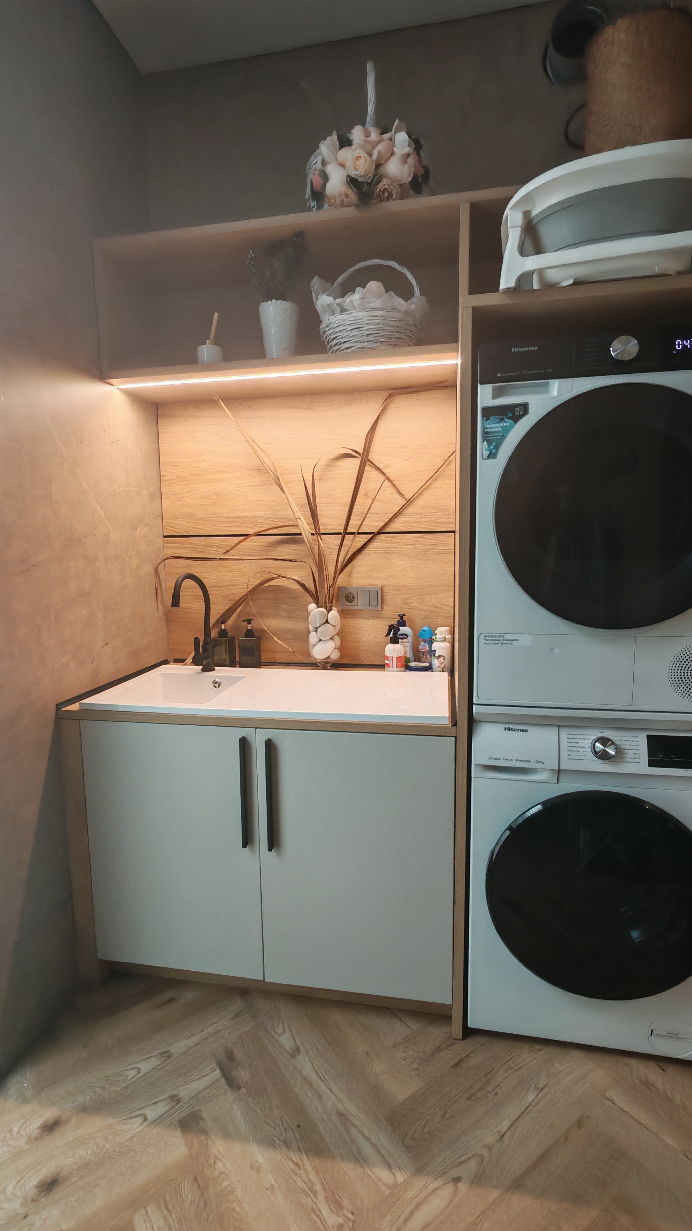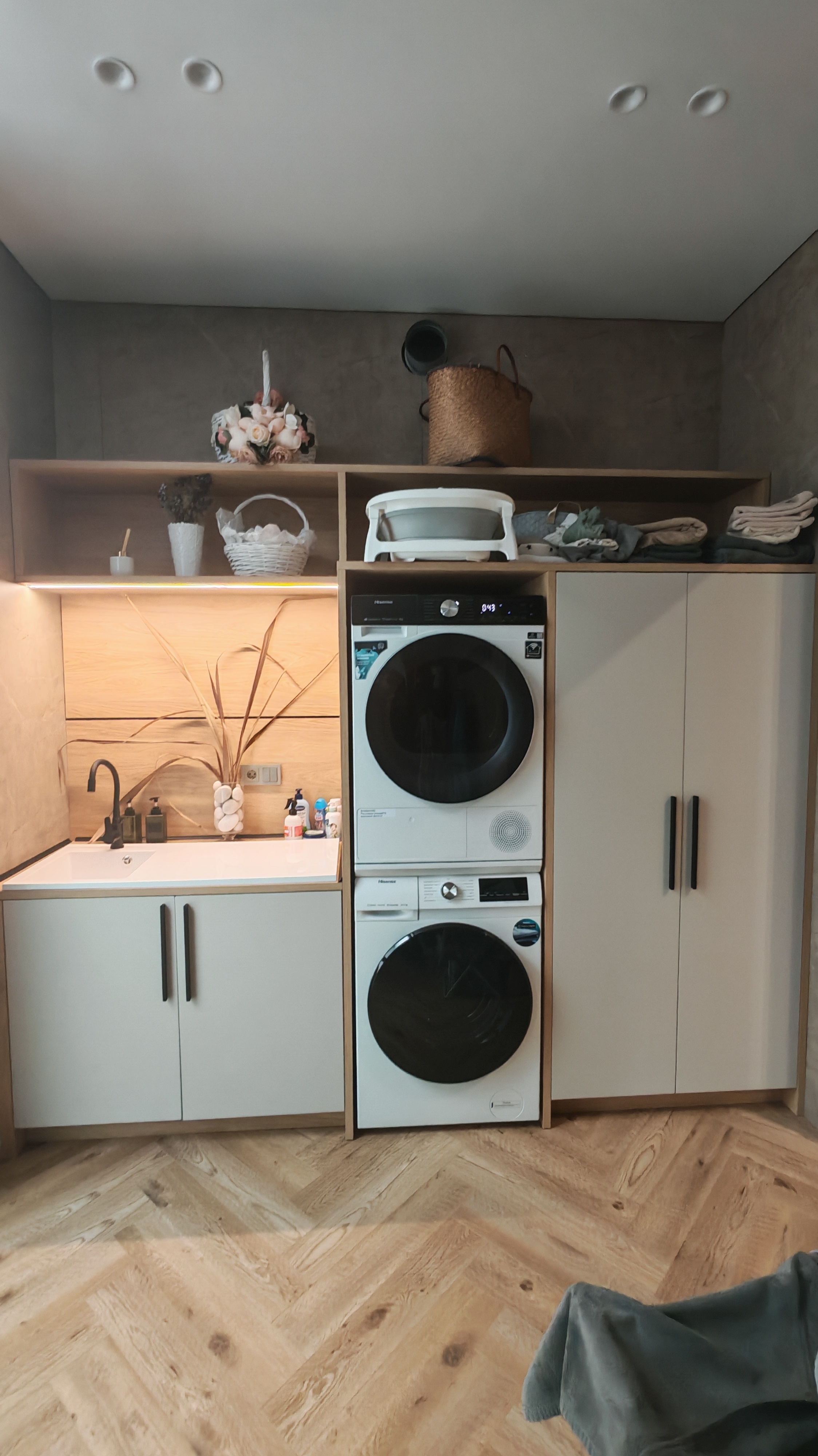 В этом проекте мы изготовили мебель для ключевых зон дома — кухни, ванной комнаты, постирочной, прихожей. А так же стеновые панели из шпона.